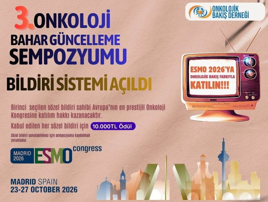Onkolojik Bakış Derneği tarafından “3. Onkoloji Bahar Güncelleme Sempozyumu” konulu bilimsel toplantımız 8-10 Mayıs 2026 tarihinde Ramada by Wyndham Gaziantep’te gerçekleştirilecektir. Türkiye’nin farklı merkezlerinden uzmanların katılacağı sempozyumda güncel onkoloji yaklaşımları ele alınacak. Etkinlik kapsamında ESMO 2026’ya katılım hakkı ve sunulan her bildiriye ödül verilecektir.
